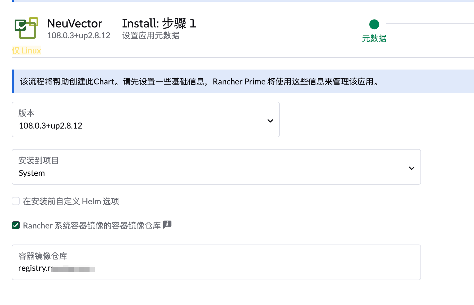 - 选择需要安装的版本、安装到哪个项目、勾选并配置 Rancher 系统容器镜像的容器镜像仓库用以从指定镜像仓库中拉取镜像。接着点击右下角的下一步。