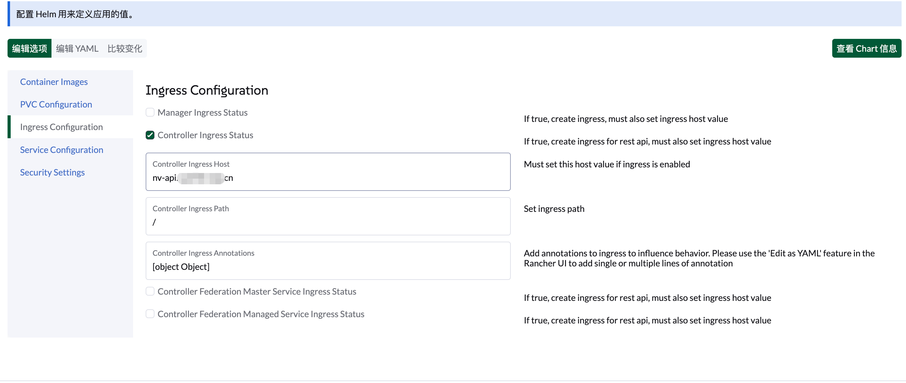 SSL 证书密文创建完成后,回到 NeuVector App 配置界面。在 Ingress Configuration 中勾选 Controller Ingress Status,并设置 Controller Ingress Host。