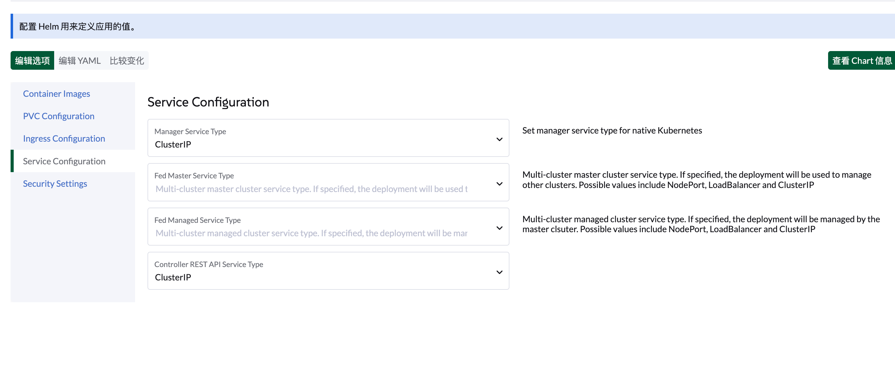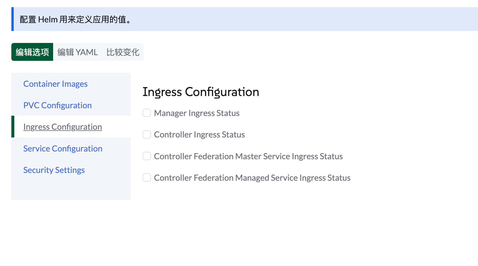 - 如果不需要通过域名访问 NeuVector Controller API,那么不需要启用 Ingress Configuration 配置。 Service Configuration 配置中,Controller REST API Service Type 选择 NodePort。
