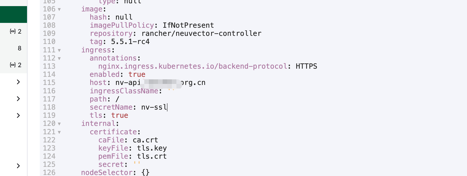 controller.ingress.tls层级,大约在 111 行前后。将 tls 设置为 true,默认为 false,并设置 secretName 为前面创建的 ssl 证书密文。